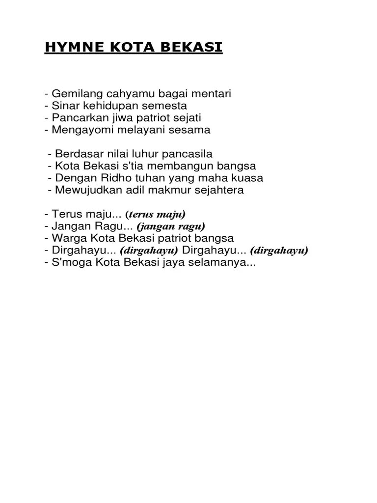 Mars Dan Hymne Kabupaten Bekasi / Lirik Lagu Hymne Kota Bekasi Enak / Play along with guitar, ukulele, or piano with interactive chords and diagrams.